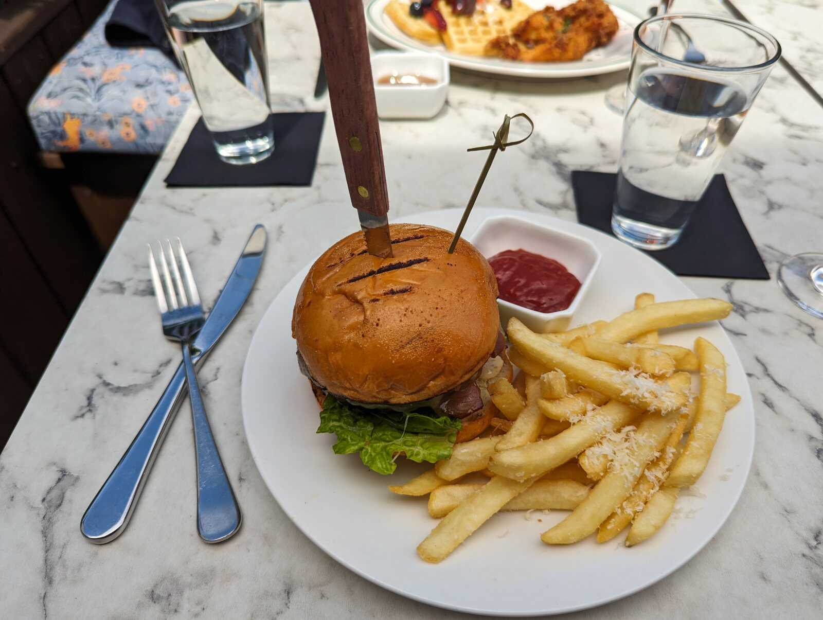 A few of us are still a bit salty about paying a $6 upcharge for very unremarkable fries to join our already $17 burgers, so you're best off just defaulting to the chicken and waffle, even though it comes with grapes, for reasons we couldn't quite discern.