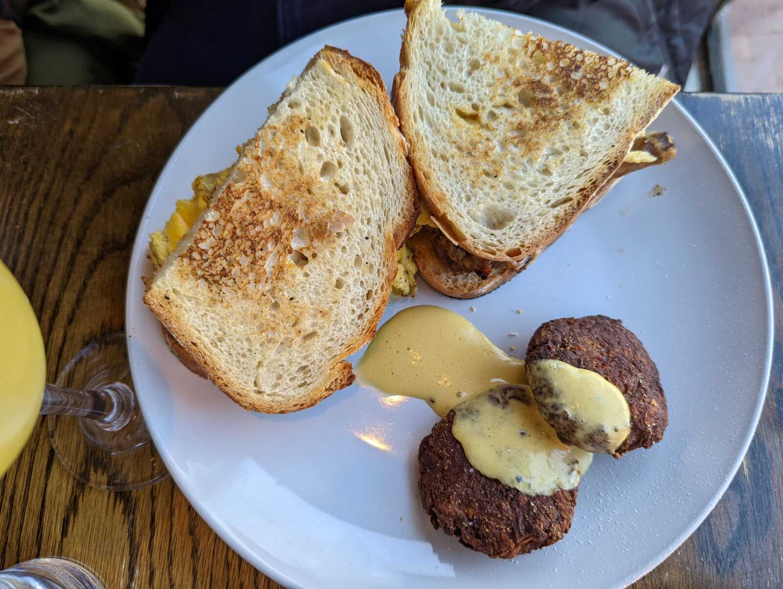 Brunch staples rule the day here, and from the chicken and waffles to the latke-enhanced breakfast sandwich, they're worth it.